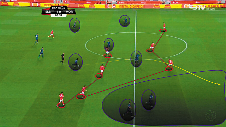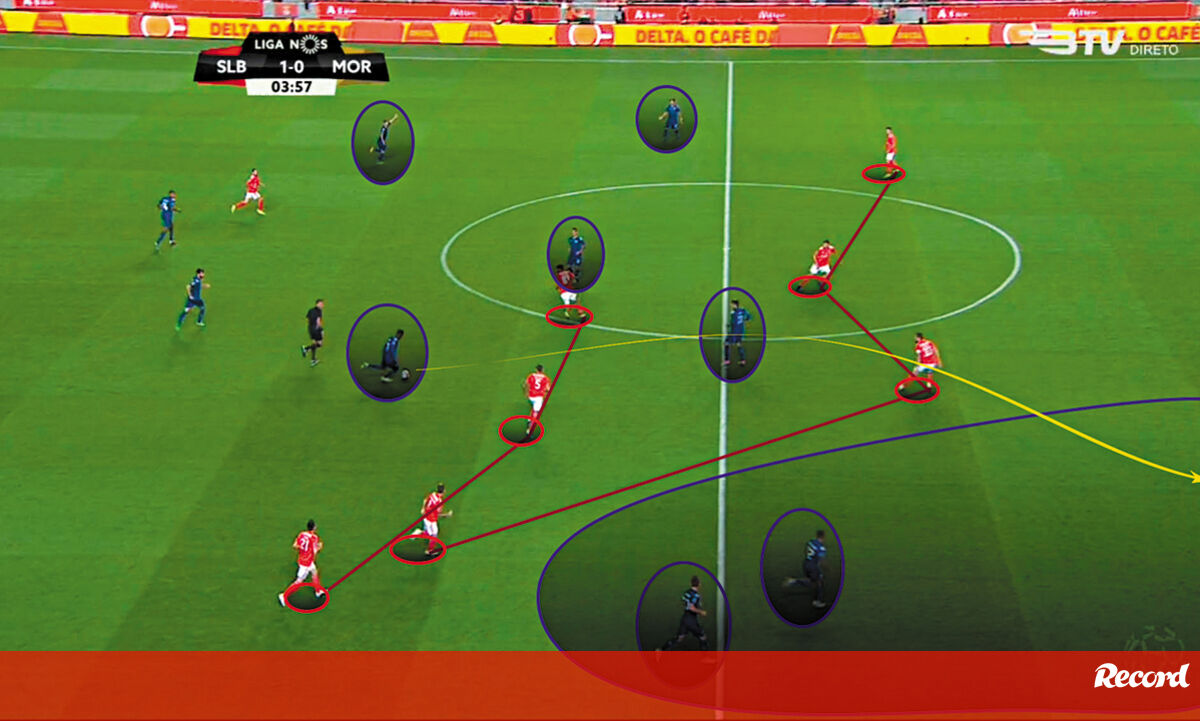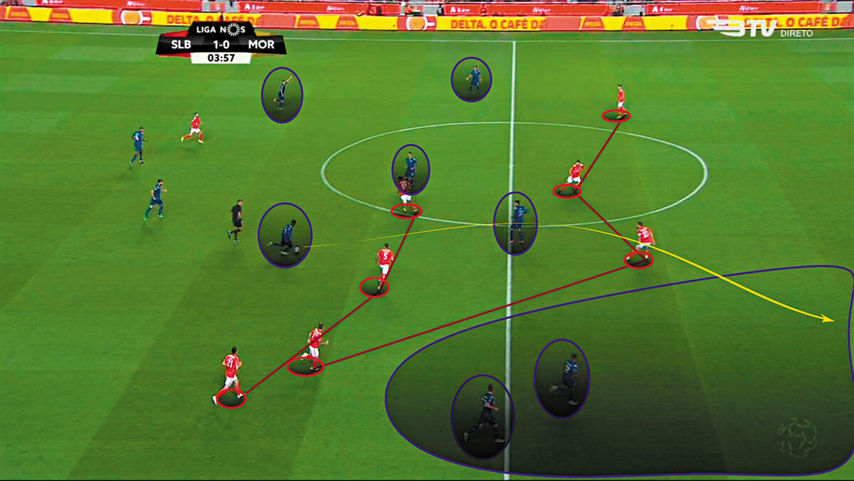 Com Jonas como referência ofensiva da habitual organização estrutural em 4x3x3, a que se juntou a titularidade de João Félix, em mais um exercício de promoção de um não convocado a titular protagonizado por Rui Vitória, o Benfica entrou com pressa de se colocar em vantagem. Conseguiu-o, na sequência de um passe equivocado de Chiquinho que redundou num sublime passe de rutura de Félix para Jonas. Parecia, enfim, que a tranquilidade, após duas derrotas de digestão incómoda, estava encontrada. Puro engano. O Moreirense agarrou-se ao seu ideário, foi audaz e não teve medo de jogar no campo todo. Procurou pressionar alto, condicionando a primeira fase de construção do rival e obstando à entrada no seu bloco [3], baixando, sempre que necessário, as suas linhas, sem que a mais recuada afundasse na sua área. Depois, nunca teve receio de assumir o jogo, circulando a bola com qualidade fruto da sagacidade com que criava linhas de passe, e soube ser pungente nas saídas rápidas para o ataque, perscrutando exaustivamente o corredor direito [1,2], espaço por onde desenhou a reviravolta. Aí, mais uma vez, desfraldou as debilidades tremendas do Benfica no momento de transição defensiva, em que se tornam cada vez mais evidentes as crateras entrelinhas e intralinhas, assim como as deficiências hediondas na realização de coberturas – é equivocado procurar encontrar em Grimaldo o culpado de um problema coletivo que tem o treinador como responsável – e na definição da última linha, saudosa do comando, dentro ou fora de campo, do professor Luisão. Inertes com os dois golos sofridos, os encarnados não souberam, fruto da previsibilidade do seu processo ofensivo [3], encontrar o caminho da baliza adversária, e foram acumulando perdas e precipitações. Foi de um passe incauto de Jardel, após disputa de bola com Nenê, que o Moreirense alinhavou o 3-1, numa rápida variação do corredor esquerdo para o central, de onde Loum disparou uma bomba. Vitória, a dez minutos do intervalo, reorganizou a equipa em 4x4x2, mudança estrutural que teve continuidade com as entradas de Salvio – que fez todo o corredor direito – e Castillo após o intervalo. A equipa nunca mais se mostrou capaz de explorar o corredor central. Procurou incessantemente os cruzamentos para a área.