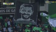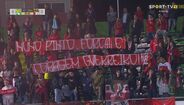 21'- Surge o minuto 21 e os adeptos do V. Setúbal homenageiam Nuno Pinto. O lateral-esquerdo, presente nas bancadas, não ficou indiferente.