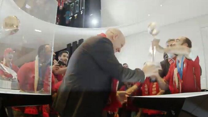 Os jogadores dançam ao som dos 'Xutos & Pontapés' e da música 'A Minha Casinha' na sala dos troféus.