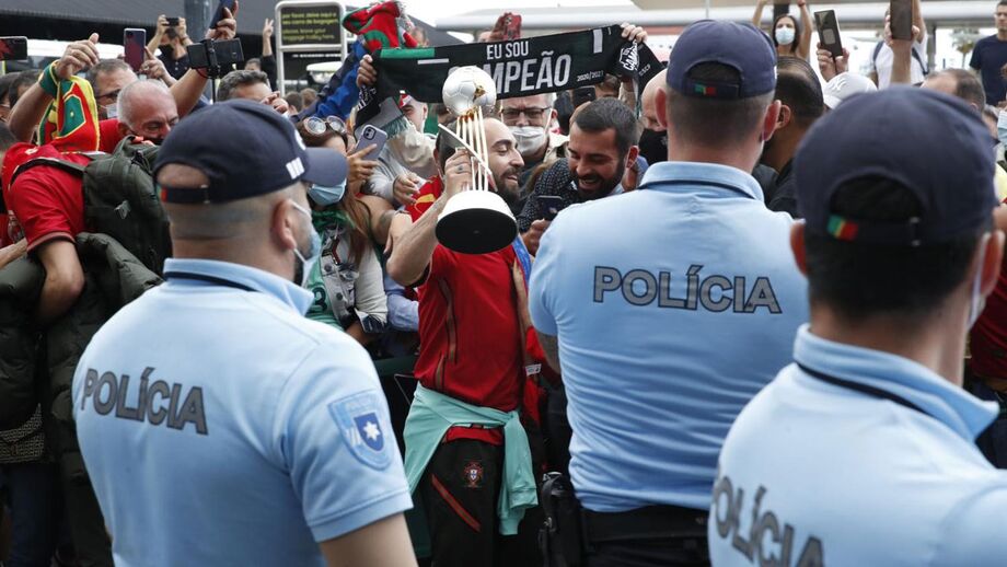 O autocarro acaba de sair do aeroporto, os adeptos cantam "campeões, campeões, nós somos campeões!"