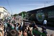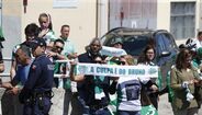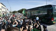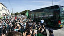15h58 - O veículo é efusivamente saudado pelos adeptos que aguardavam a equipa; dentro do autocarro os jogadores retribuem o carinho e acenam.