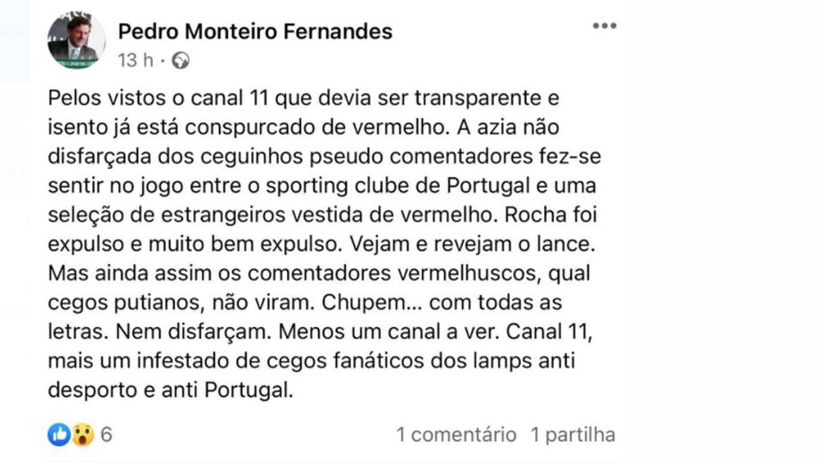 "Pelos vistos o canal 11 que devia ser transparente e isento já está conspuscardo de vermelho. A azia não disfarçada dos ceguinhos pseudo comentadores fez-se sentir no jogo entre o Sporting Clube de Portugal e uma seleção de estrangeiros vestida de vermelho. Rocha foi expulso e muito bem expulso. Vejam e revejam o lance. Mas ainda assim os pseudo comentadores vermelhuscos, qual cegos putianos, não viram. Chupem... com todas as letras. Nem disfarçam. Menos um canal a ver. Canal 11, mais um infestado de cegos fanáticos dos lamps anti desporto e anti Portugal", pode ler-se numa publicação no Facebook.