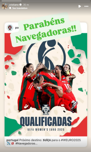 "Parabéns, navegadoras", escreveu o capitão da Seleção Nacional numa story do Instagram.