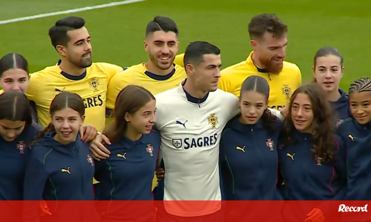 No início dos 15 minutos de treino aberto à comunicação social foi possível assistir a um momento de descontração com a Seleção feminina Sub-16 a subir ao relvado da Cidade do Futebol para uma fotografia com a Seleção A masculina.