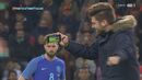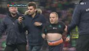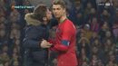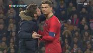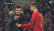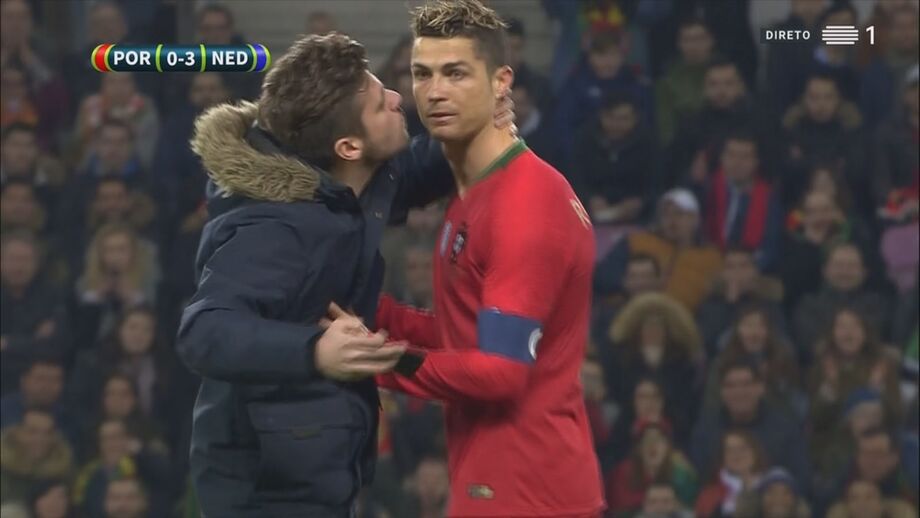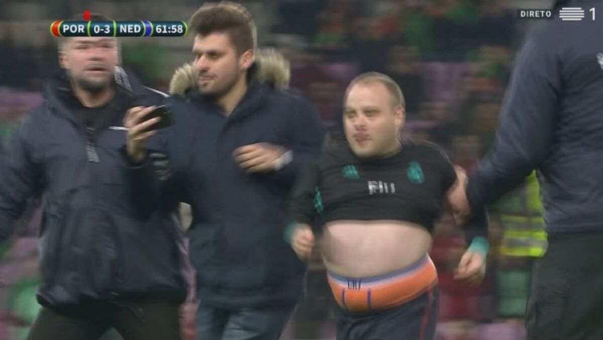 Com a rara oportunidade de verem Cristiano Ronaldo mais de perto, quatro adeptos saltaram para o relvado durante a segunda parte à procura de tirar algumas ‘selfies’ e até filmar o momento ou, pelo menos, de dar um abraço ao capitão da Seleção Nacional. Os três primeiros acabaram por ser intercetados de forma relativamente pacífica pelas forças de segurança – curiosamente, um deles vestia boxers da marca... CR7 –, mas o último apareceu de forma mais inesperada e até Fernando Santos esteve perto de sofrer as consequências na pele.
