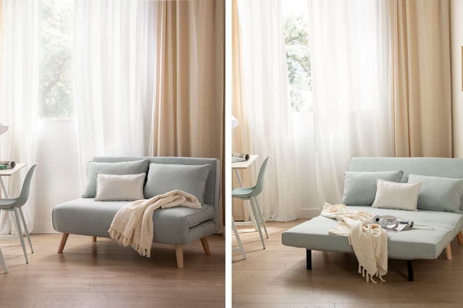 Um dos maiores aliados dos espaços pequenos é o sofá-cama Noa de 2 lugares água-marinha. Durante o dia funciona como um sofá compacto e confortável para a sala, mas em poucos segundos transforma-se numa cama extra graças ao sistema de abertura click-clack, uma solução perfeita para receber visitas inesperadas ou para apartamentos onde cada divisão precisa de cumprir mais do que uma função.