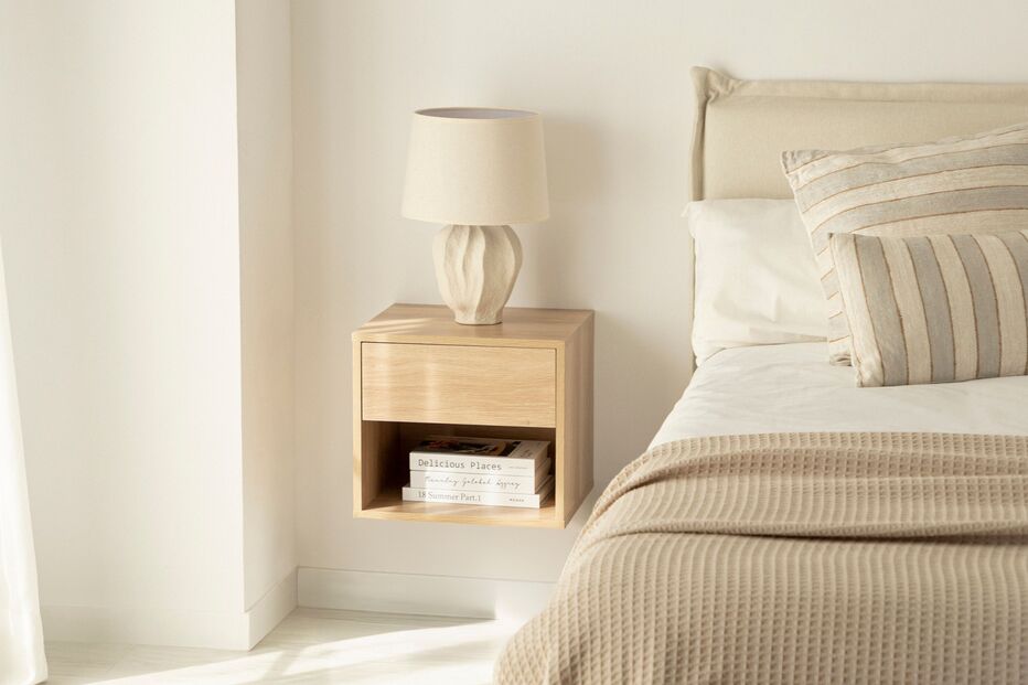 VER PREÇOPara quartos compactos, a mesa de cabeceira flutuante Harbor com 1 gaveta em madeira cor natural é uma escolha particularmente inteligente. Ao ser fixada na parede, liberta espaço no chão, cria uma sensação visual mais leve e ainda oferece arrumação suficiente para os essenciais da noite.