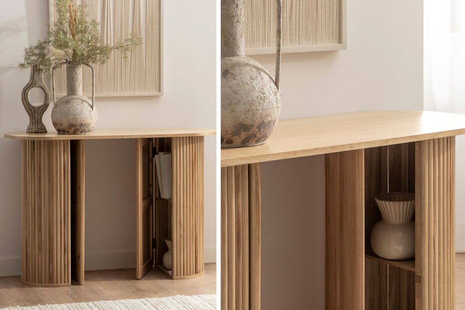 VER PREÇOAté a entrada da casa pode beneficiar de mobiliário multifuncional. A consola Trena em folheado de freixo e madeira de paulownia funciona como apoio decorativo para chaves, livros ou uma pequena planta, mas também ajuda a estruturar visualmente o hall de entrada sem o sobrecarregar... por baixo os recantos são úteis para arrumar alguns objetos.
