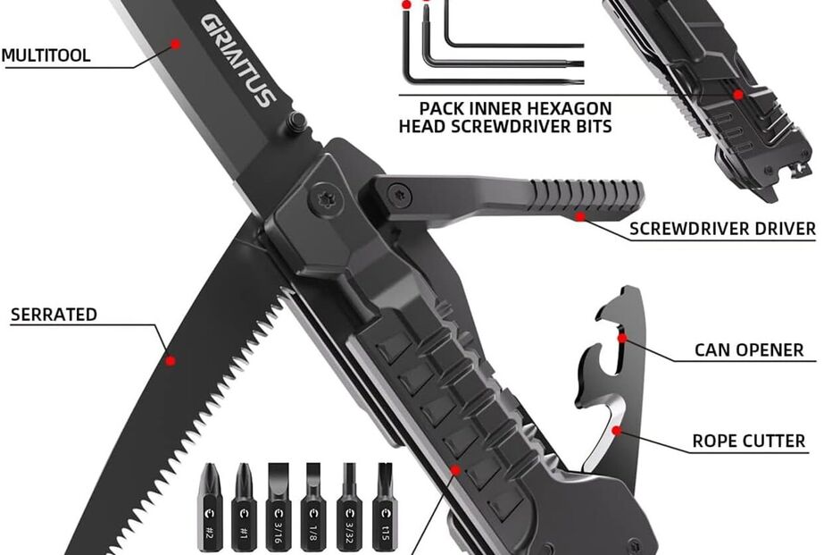 Esta espécie "canivete suiço" com mais funções do que o habitual pode servir para uma pequena reparação, o corte de alimentos, abertura de embalagens, etc. São 17 ferramentas num só artigo e ainda inclui alguns fósforos e um apito de emergência.