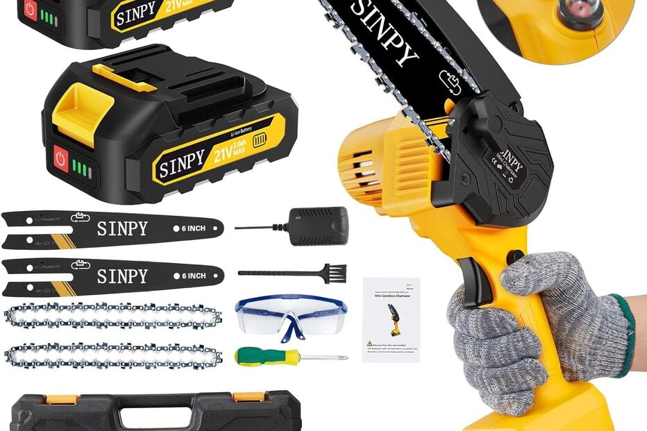 A Sinpy é ideal para cortar ramos, ou lenha. Funciona a bateria e é entregue com um prático kit de acessórios