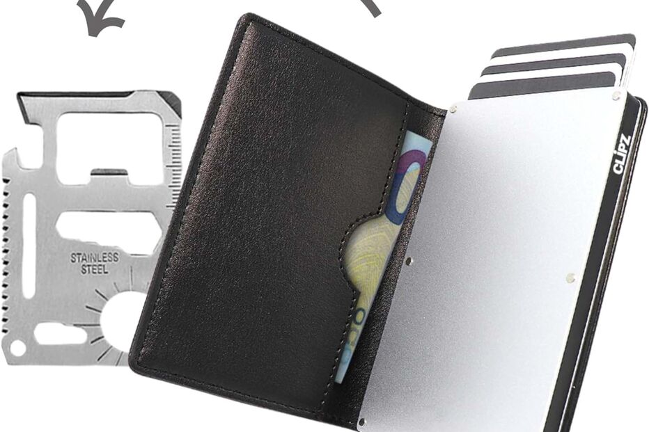 É uma carteira de couro c om um compartimento para notas e porta-cartões metálico RFID que traz um acessório muito curioso: um cartão multiusos de aço inoxidável que serve como abre-latas, régua, entre outras funções. O porta-cartões minimalista foi desenhado para reduzir o espaço até 80%, permitindo que leve ate 9 cartões de forma organizada.