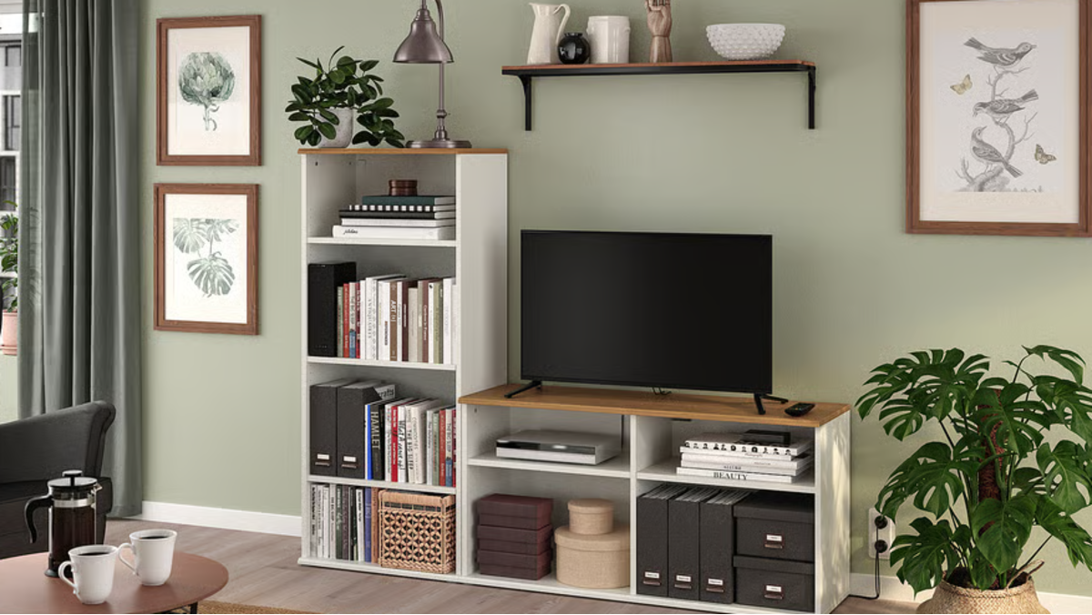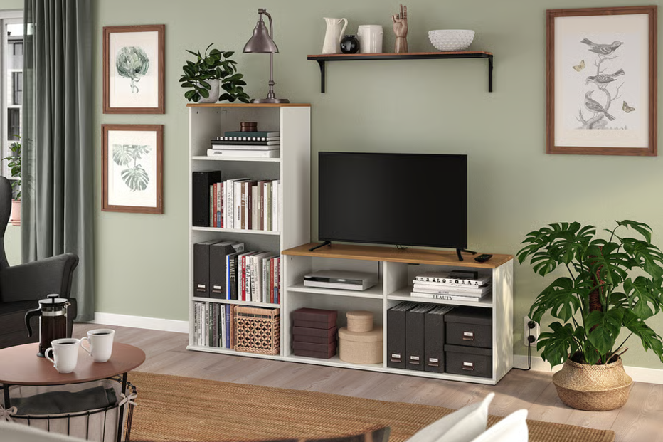 A gama SKRUVBY tem um aspeto tradicional com módulos de arrumação independentes que podem ser coordenados. Esta solução de TV com arrumação aberta dá um toque acolhedor à divisão e pode enchê-la com as coisas de que mais gosta.
