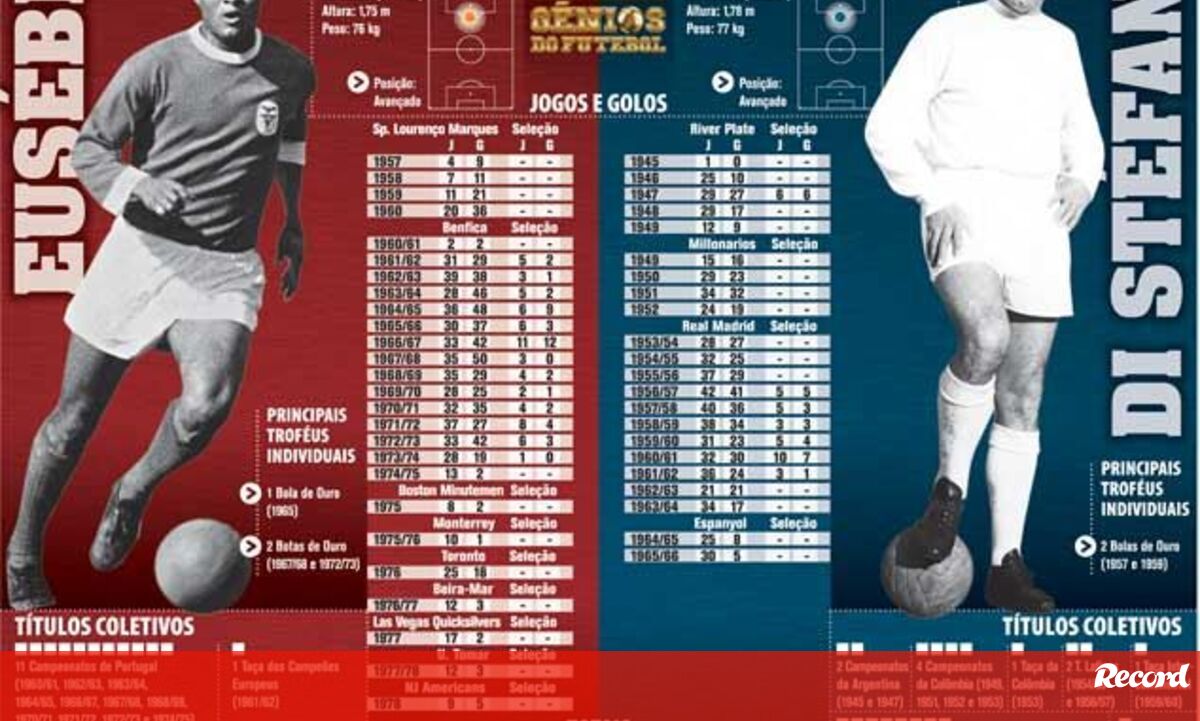 Eusébio terminou a carreira com uma Bola de Ouro, ao passo que Di Stéfano ficou com duas no currículo, além dos oito campeonatos espanhóis e das cinco Taças dos Campeões Europeus.Já Eusébio arrecadou 11 títulos de campeão nacional pelo Benfica, ainda alcançou duas vezes a Bota de Ouro e venceu a já referida Taça dos Campeões Europeus. Curiosamente, tanto Eusébio e Di Stéfano morreram em 2014.