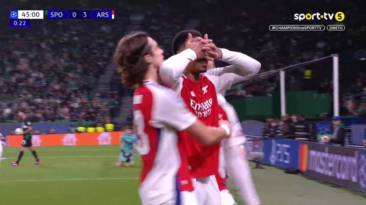 Aos 45'+1 do Sporting-Arsenal, Gabriel Magalhães fez o 3-0 para os gunners e celebrou à... Gyökeres.