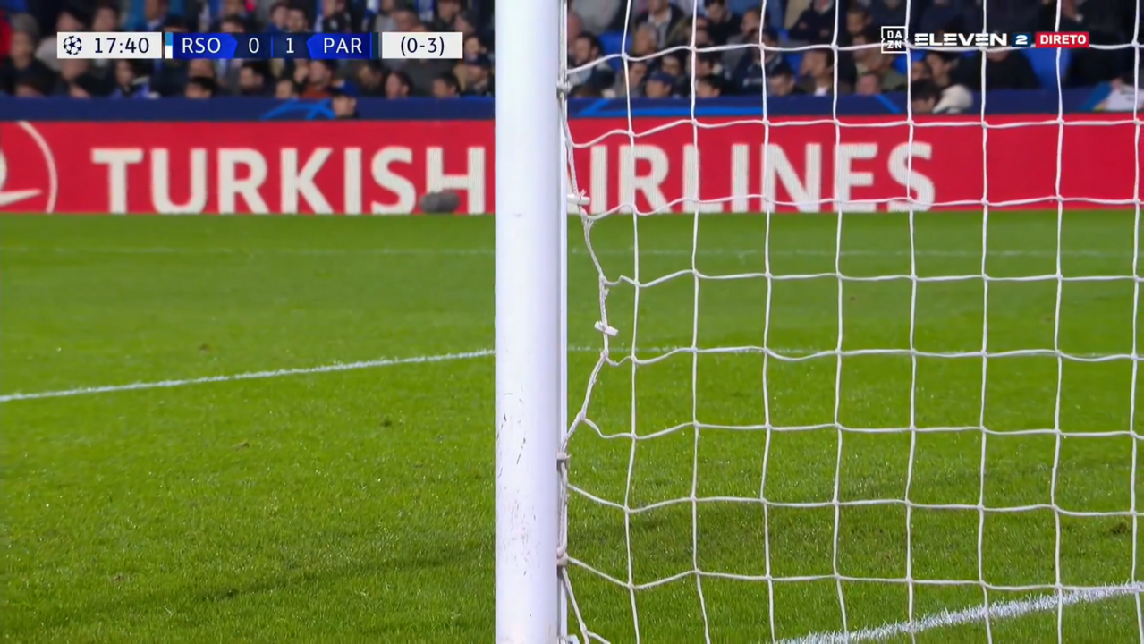 Kylian Mbappé abriu o marcador no Real Sociedad-Paris SG ainda na primeira parte, com um remate colocadíssimo que até deixou 'marcas'... na rede da baliza basca.