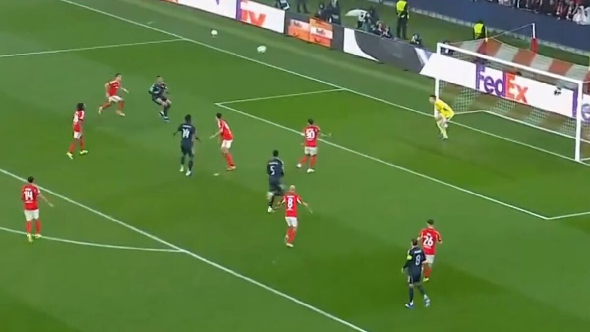 À passagem da meia hora de jogo, já depois de o Benfica desperdiçar algumas oportunidades flagrantes, o Real Madrid conseguiu encontrar um buraco na muralha defensiva dos encarnados e não facilitou. Asencio, a partir do corredor direito, tirou um cruzamento bem medido para o segundo poste e Mbappé, sem oposição, não facilitou.