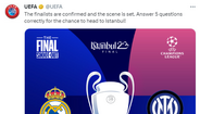 A horas do Manchester City-Real Madrid, duelo da segunda mão das meias-finais da Liga dos Campeões, a UEFA colocou os merengues na final da competição através de uma publicação nas redes sociais onde encaminhava os seus seguidores para uma página de acesso aos bilhetes para o derradeiro jogo em Istambul, frente ao Inter Milão.