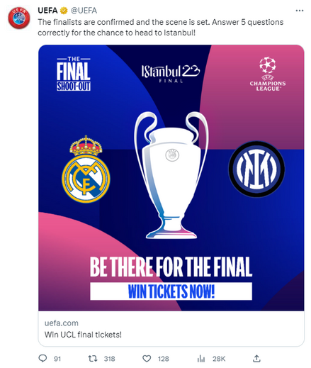 A publicação, que rapidamente foi partilhada por milhares de utilizadores do Twitter, foi entretanto apagada. "Os finalistas estão confirmados e o cenário está pronto. Responde a cinco questões de forma certeira para teres a possibilidade de ir até Istambul", podia ler-se na publicação que surgia na página oficial da UEFA.