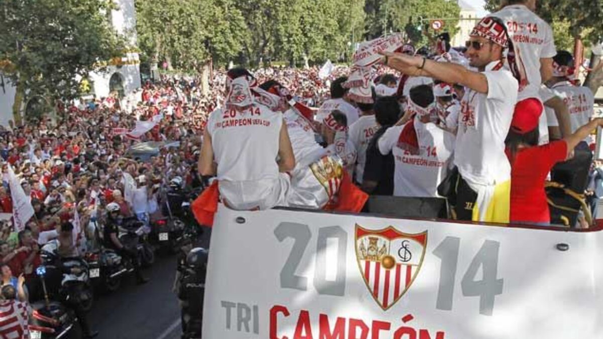Opercurso foi delineado com o final do encontro de Turim, e cumprido à risca, apesar dos naturais atrasos. Após a chegada ao aeroporto, a comitiva seguiu num autocarro convencional até La Cartuja, onde se iniciou um passeio de barco pelo rio Guadalquivir, que haveria de terminar junto à Torre do Ouro. Os milhares de adeptos acompanharam depois o autocarro descapotável que seguiria pelas ruas até à catedral, onde a comitiva sevilhana prestou homenagem à Virgem dos Reis.