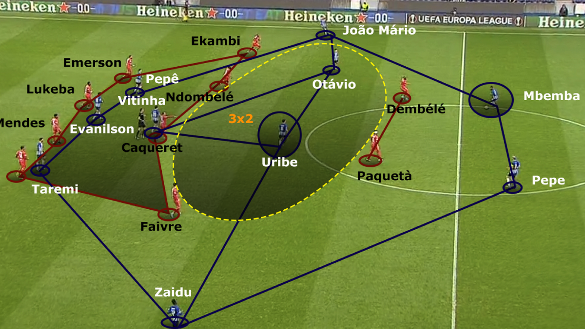 Pelo terceiro jogo consecutivo, Sérgio Conceição, partindo de uma estrutura em 4x1x4x1, definiu, em momento defensivo, uma última linha com 5 unidades [2], com Uribe a posicionar-se entre Mbemba e Pepe [2], menos expostos à mobilidade de Dembélé e Paquetà, apoiados pelo criativo Faivre e pelo explosivo Ekambi, extremos incisivos a perscrutarem diagonais. Com bola, o colombiano alternou o papel de terceiro elemento na primeira fase de construção, garantindo supremacia sobre a primeira linha de pressão do Lyon, organizado em 4x4x2 [1], com o posicionamento nas costas desta [1], tornando-se em solução de passe vertical para Mbemba e Pepe [1]. O que permitia ao FC Porto destapar um espaço crucial entre a linha intermédia e ofensiva do antagonista [1], afiançando nova situação de superioridade no corredor central [1], até porque Caqueret e Ndombelé tinham que se preocupar com os interiores Vitinha e Otávio.