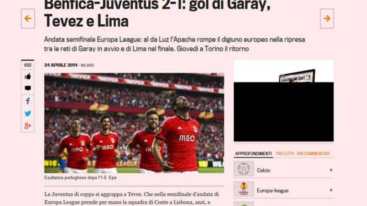 "A Juventus agarra-se a Tévez. Na primeira mão da meia-final da Liga Europa, pegou na equipa de Conte pela mão, de alguma forma chateado, puxou-a pela manga e limitou os danos. Acabou 2-1 para o Benfica. (...) Vamos ser honestos: poderia ter sido bem pior, especialmente depois de um início a bater com a cabeça na parede."