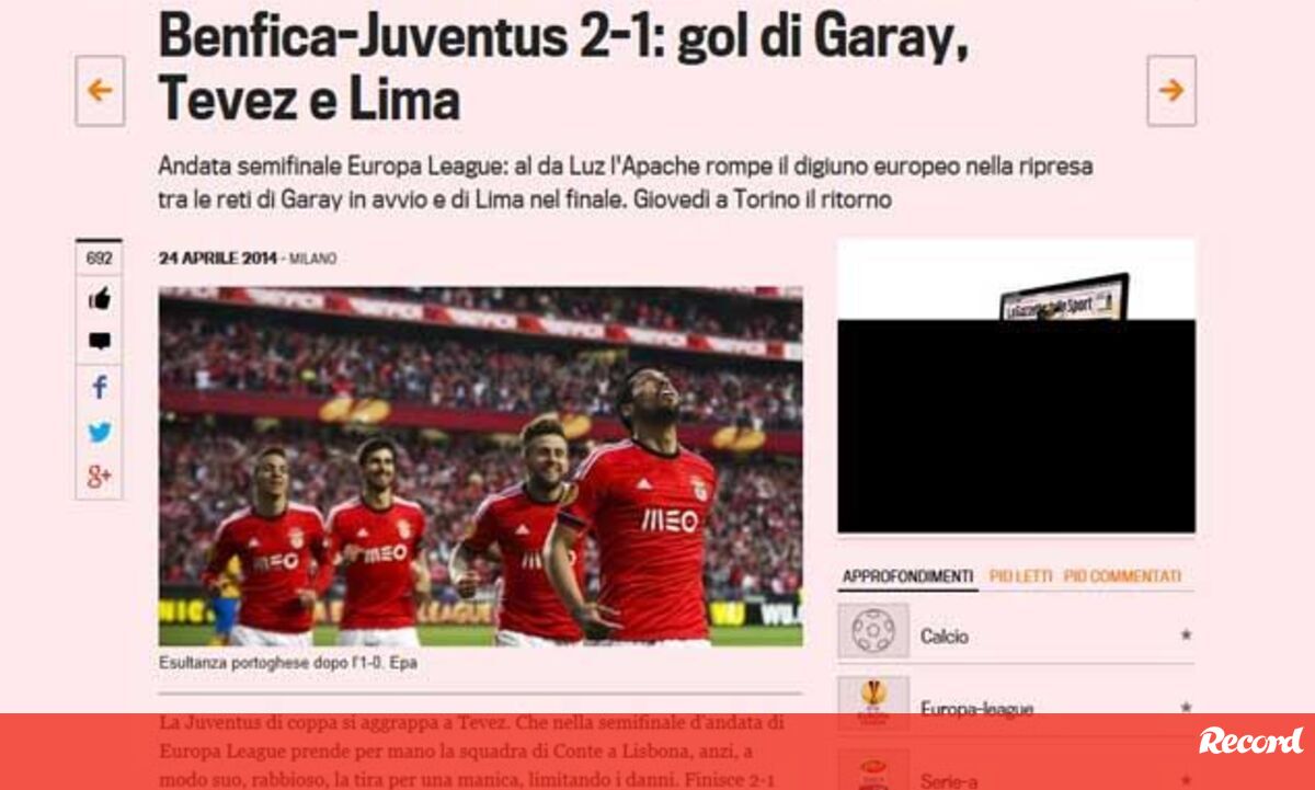 A fotografia de Tévez está em destaque em praticamente toda a imprensa italiana, mas os festejos do Benfica também fazem (obviamente) eco. Mas o argentino não bastou para travar os encarnados na 1.ª mão das meias-finais da Liga Europa (2-1)