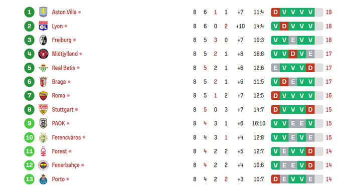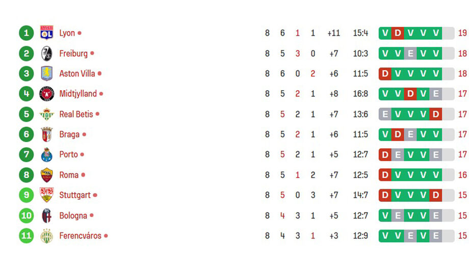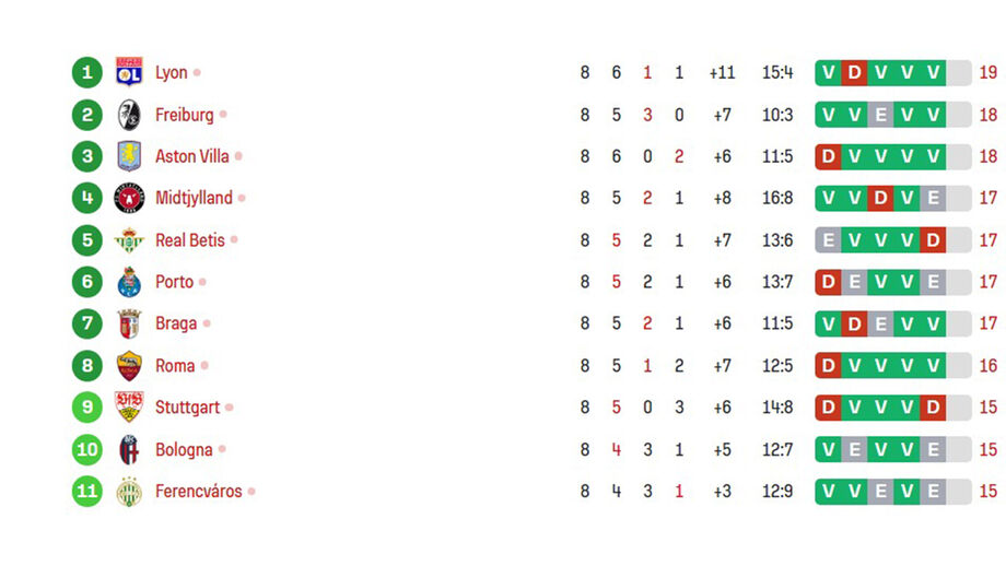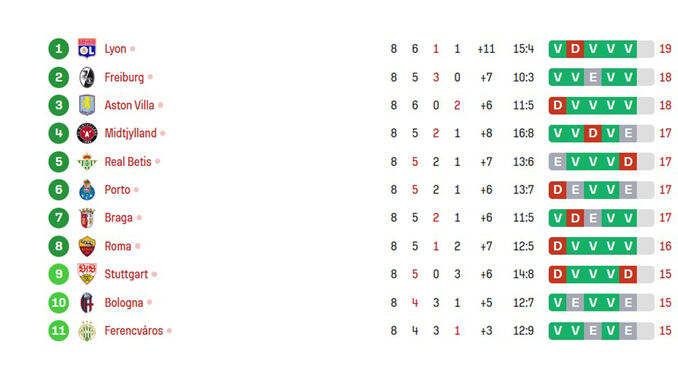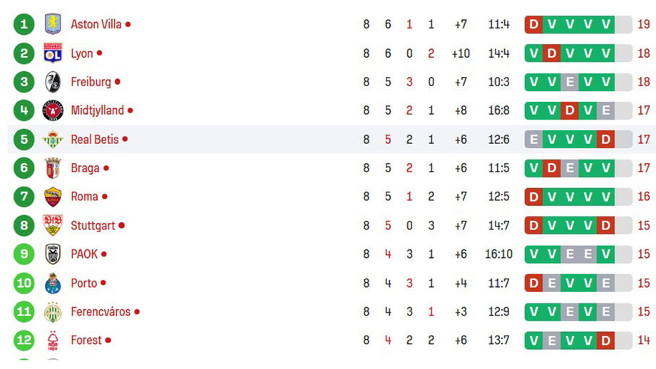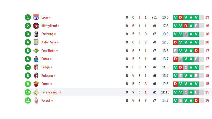 Há pouco foi anulado... agora conta mesmo! O Betis está na frente diante do Feyenoord. Os espanhóis chegam aos 17 pontos e passam para 5.º, à frente do Sp. Braga, que assim desce a 6.º. E, praticamente ao mesmo tempo, o Nottingham marca ao Ferencvaros e, com 3 pontos no bolso, salta para 11.º.