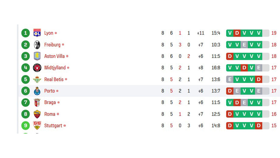 Em caso de derrota do Sp. Braga, serão necessárias outras três 'ajudas' em simultâneo, a envolver Midtjylland, Roma, Ferencvaros, Betis, FC Porto, Genk e Estrela Vermelha, que são as equipas entre os 13 e os 16 pontos atualmente. E, uma vez mais, um golo pode fazer toda a diferença.