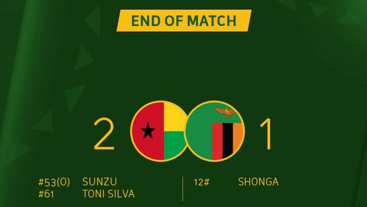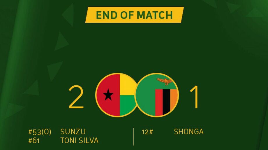 Em Bissau, os visitantes inauguraram o marcador aos 13 minutos, através do avançado Justin Shonga, mas a seleção anfitriã virou o resultado a seu favor durante a segunda parte, com golos do defesa Stoppila Sunzu, aos 53, e do avançado Toni Silva, aos 61.