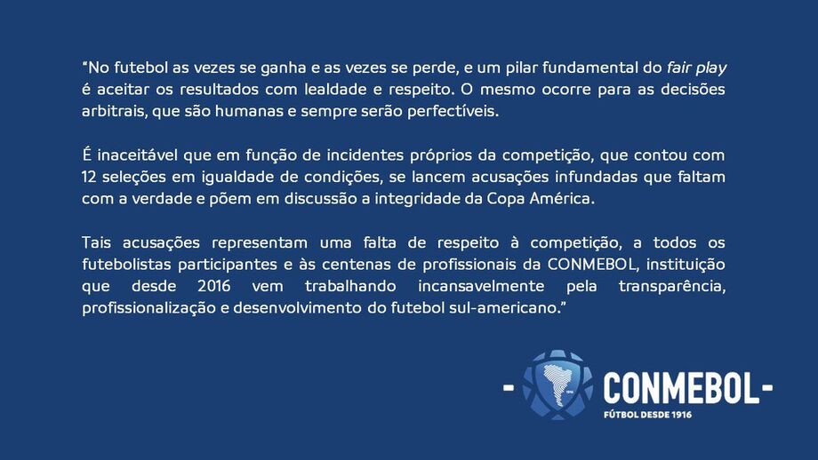 "É inaceitável que em função de incidentes próprios da competição, que contou com 12 seleções em igualdade de condições, se lancem acusações infundadas que faltam com a verdade e põem em discussão a integridade da Copa América", refere a Conmebol.