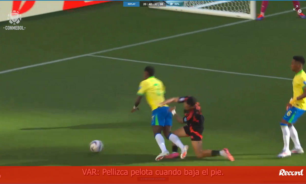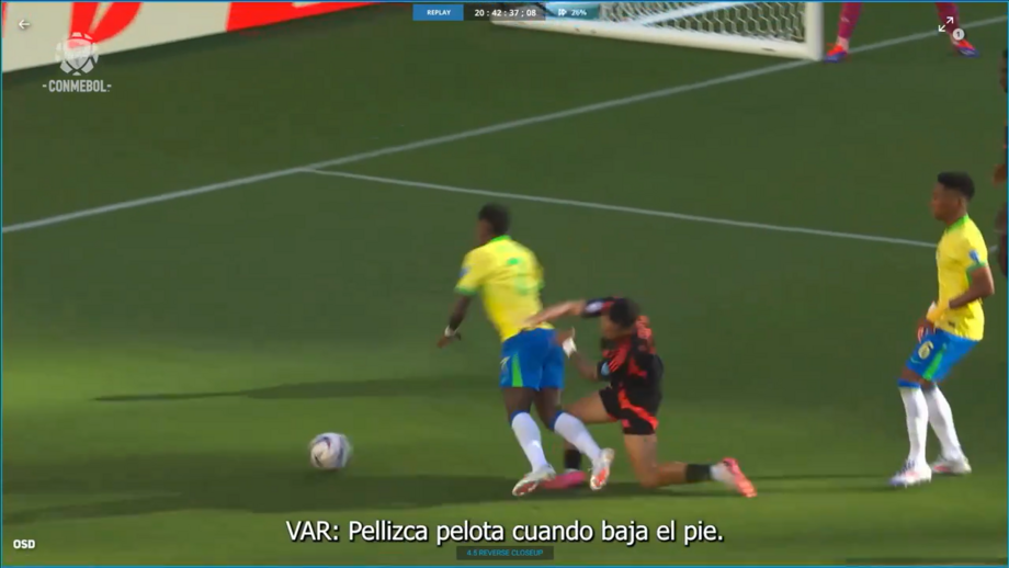 A entidade que supervisiona o futebol sul-americano considerou que o VAR [o argentino Mauro Vigliano], de forma protocolar, passou a analisar a jogada "com diferentes ângulos, velocidades e considerações, e não conseguiu identificar que o defesa não tocou na bola antes de tocar de forma imprudente com o atacante brasileiro".