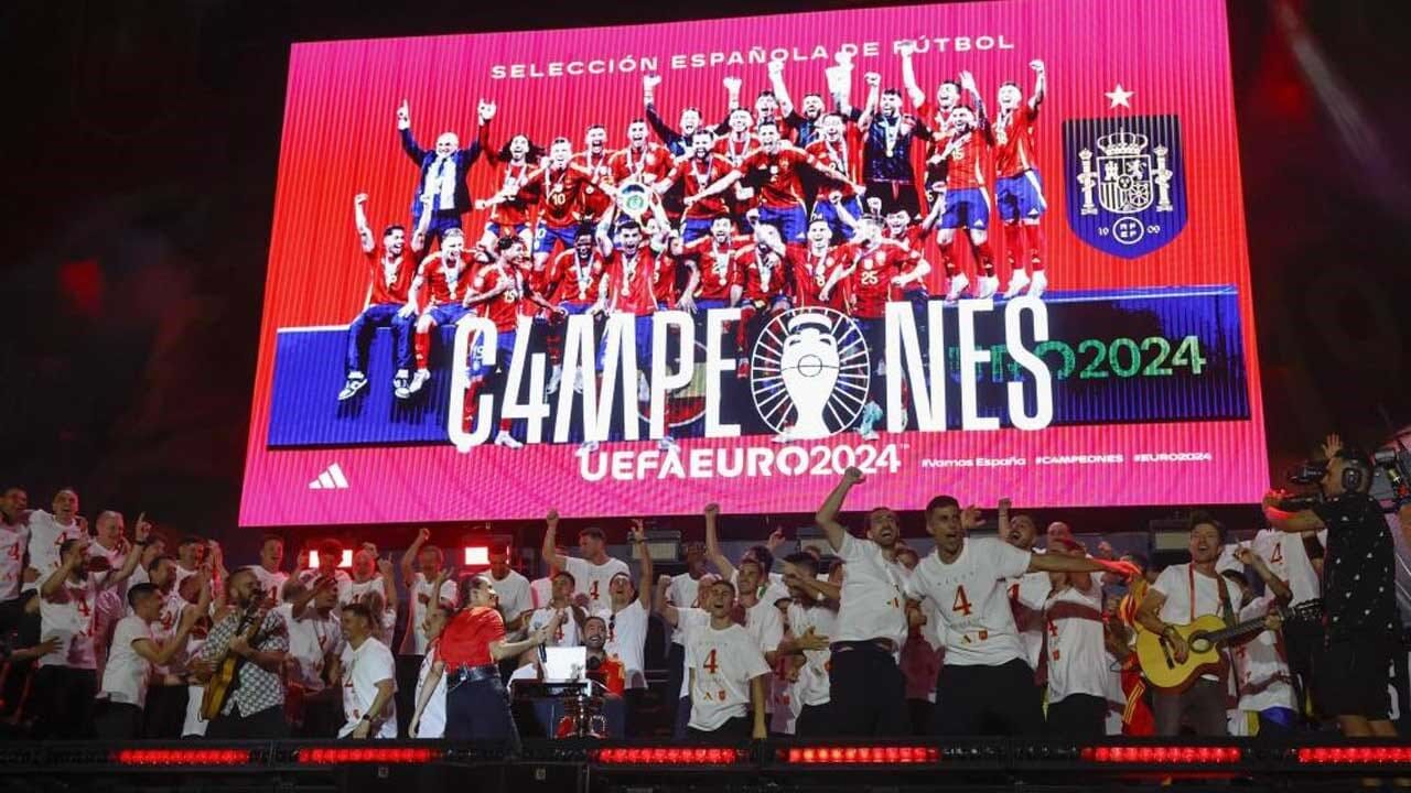 Os vencedores do Euro aterraram em Madrid ao início da tarde, com o capitão Morata e o selecionador Luis de la Fuente a mostrar o troféu Henri Delaunay - o quarto da história para Espanha, após 1964, 2008 e 2012 - ao país pela primeira vez. O epicentro foi na Praça Cibeles, onde os 27 heróis - incluindo Gavi, que falhou todo o torneio por lesão - chegaram num autocarro panorâmico escoltado por dezenas de milhares de pessoas, a formar uma autêntica onda ‘roja’.