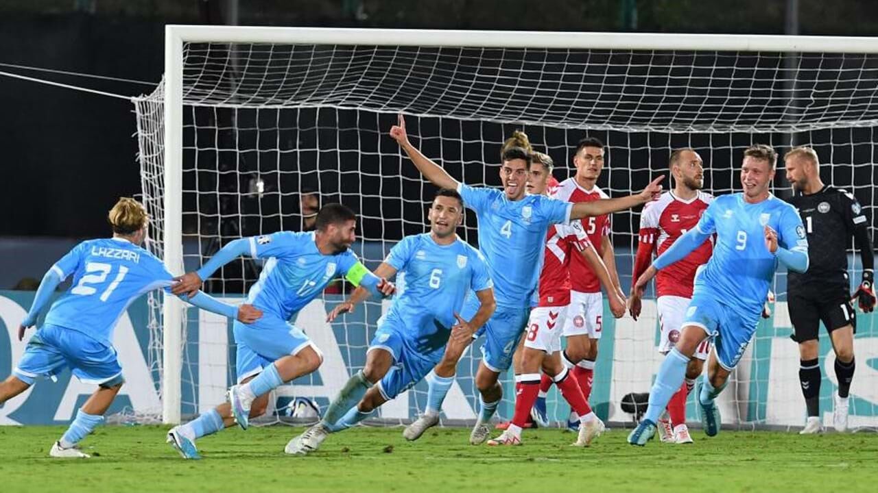 A jogar em casa, a modesta equipa de San Marino aguentou o nulo no marcador durante quase toda a primeira parte, sendo apenas quebrada ao minuto 42, com o golo de Rasmus Hojlund.