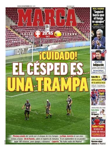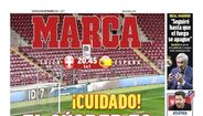 Ora, se De la Fuente não quer já arranjar desculpas com o relvado, a 'Marca' chamou o assunto à primeira página da edição de hoje com um contundente alerta: "Cuidado! O relvado é uma m...", titularam, dando conta do "péssimo estado" do palco do jogo afetado por "três fungos".