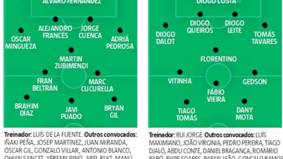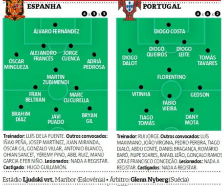 Em relação ao onze com a Itália, Portugal deve apresentar, em Maribor, uma nova ‘roupagem’. Rui Jorge não o confirmou, mas levantou o véu a possíveis alterações no meio-campo, dado que Daniel Bragança "sofreu um ligeiro toque" nos quartos-de-final, mas ontem treinou sem limitações. Também pode haver mexidas no ataque, zona em que Tiago Tomás pode explorar a linha defensiva subida dos espanhóis.