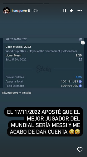 Sergio Agüero revelou esta segunda-feira ter ganho mais de 7.700 euros com uma aposta desportiva feita em 17 de novembro. No boletim, que o antigo avançado argentino fez questão de partilhar nas redes sociais, é possível ver que apostou 1.001 dólares americanos (cerca de 940 euros) como Lionel Messi seria eleito o Melhor Jogador do Mundial'2022.