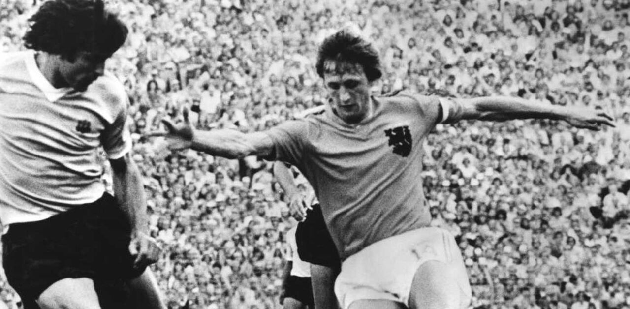 Final de Munique. Na final, com a RFA, Cruijff começou ao seu nível, sofrendo penálti de Uli Hoeness logo no primeiro minuto do jogo. Os alemães dariam a volta ao marcador antes do intervalo e, com essa reviravolta, provocaram danos irreparáveis na máquina holandesa. Cruijff enervou-se, perdeu o senso comum das coisas, deixou-se levar pelo calor da luta e tentou resolver sozinho. Não conseguiu. Tal como Puskas e Eusébio, também ele foi herói de um Mundial
