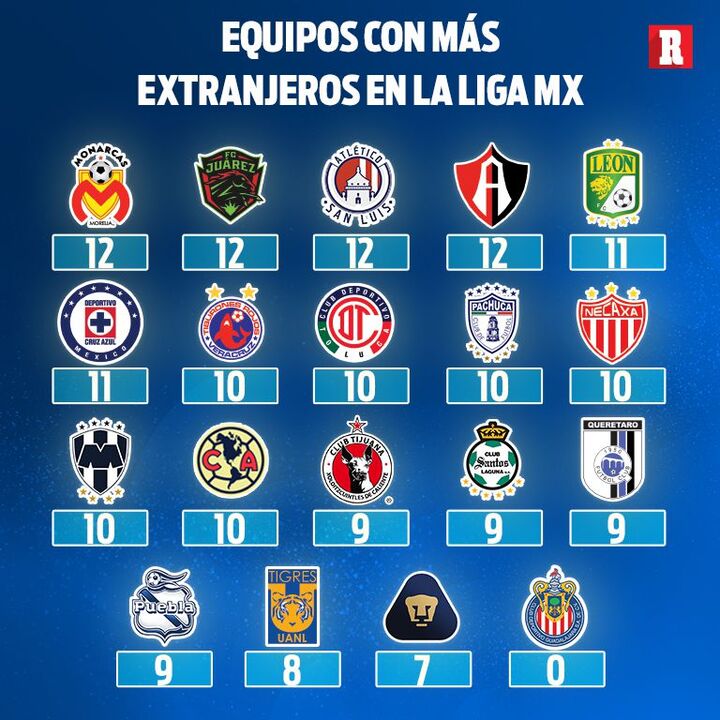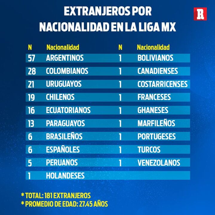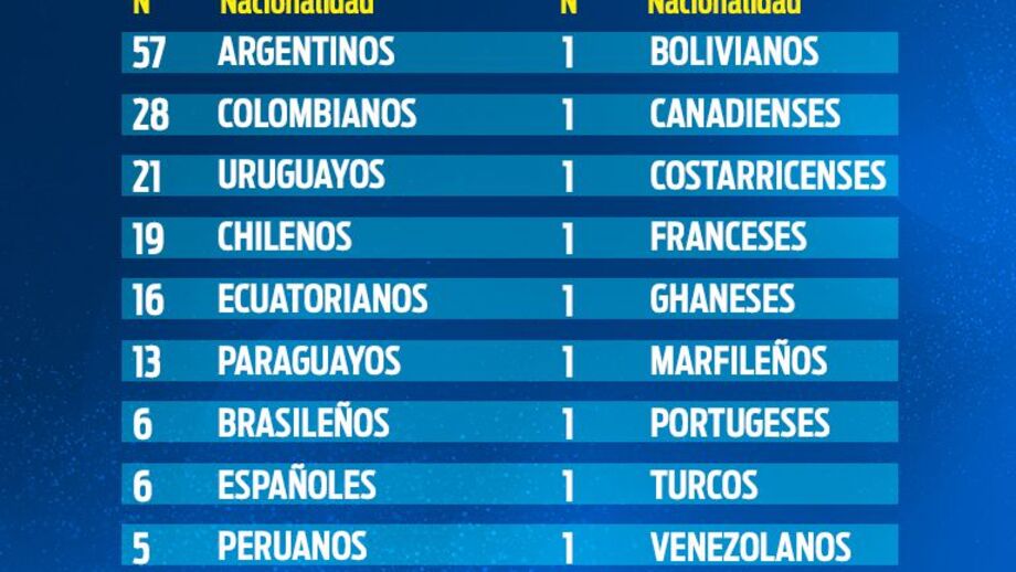 O diário ‘Récord’ fez uma análise aos plantéis dos clubes que compõe a principal liga daquele país e descobriu que a Argentina é o país que mais jogadores ‘empresta’ à competição. Um total de 57 futebolistas nascidos na Argentina atuam neste momento na liga em questão, sendo seguidos pelos colombianos, com 28 elementos.