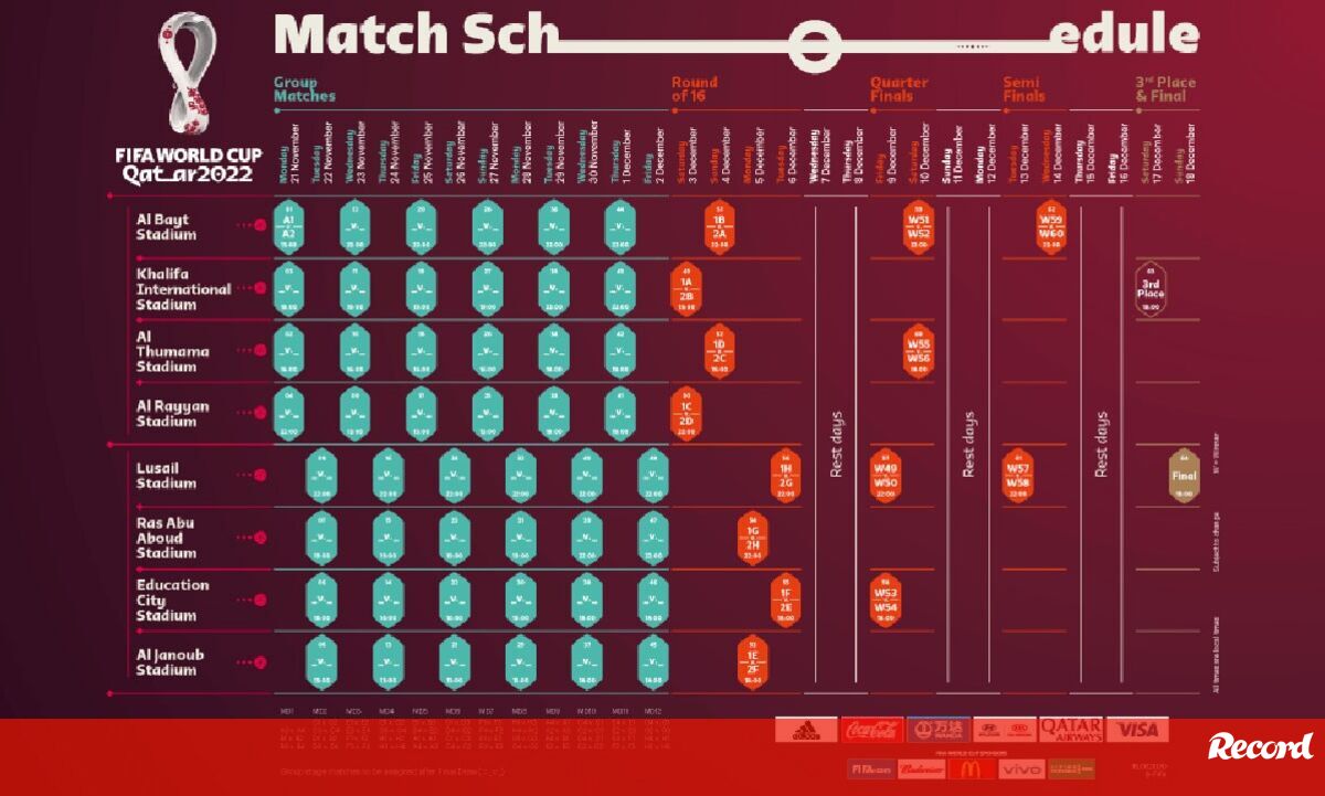 A programação do primeiro Mundial a ser disputado nos meses de novembro e dezembro, para contornar as altas temperaturas no Qatar, terá jogos com início às 13:00 locais (11:00 em Lisboa), 16:00 (14:00), 19:00 (17:00) e 22:00 (20:00).