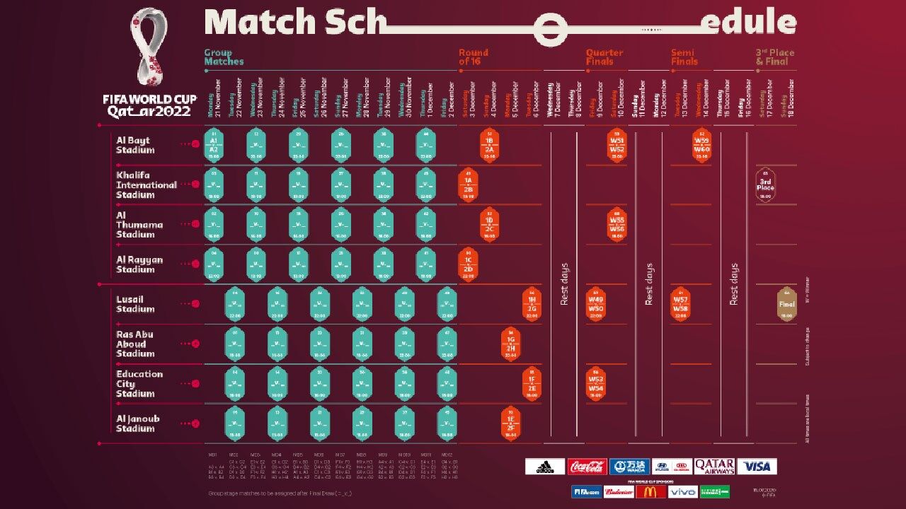 A seleção do país anfitrião abrirá o primeiro Mundial a disputar no Médio Oriente, em 21 de novembro, pelas 13:00 (11:00 em Lisboa), no Estádio Al Bayt, com capacidade para 60.000 pessoas. O início da final está previsto para as 18:00 de 18 de dezembro, no estádio Lusail, com capacidade para 80.000.