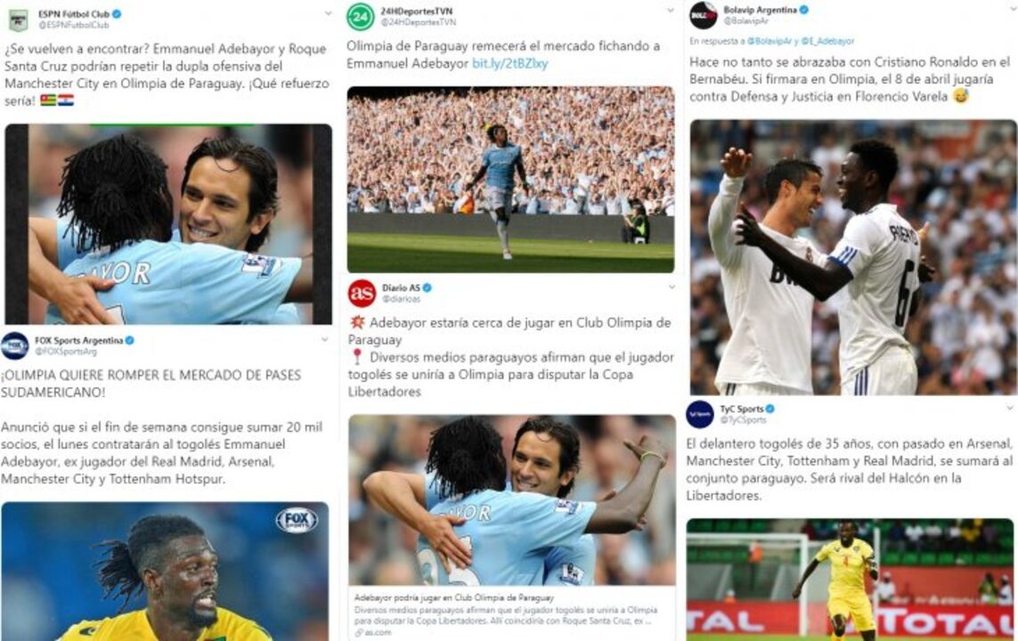É a ‘bomba’ do dia no futebol sul-americano e no Paraguai está a agitar (e muito) os adeptos do desporto-rei. Emmanuel Adebayor está a caminho do Club Olimpia, onde reencontrará Roque Santa Cruz, com quem alinhou ao serviço do Manchester City há 10 anos.
