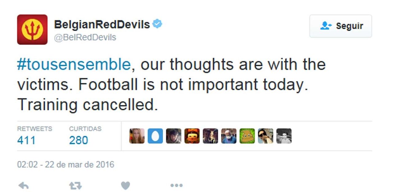 O treino da seleção belga, previsto, para esta terça-feira foi cancelado por causa dos trágicos acontecimentos ocorridos em Bruxelas. "Os nossos pensamentos estão com as vítimas. O futebol hoje não é importante. O treino foi cancelado", comunicou a federação belga na sua conta na rede social do Twitter.