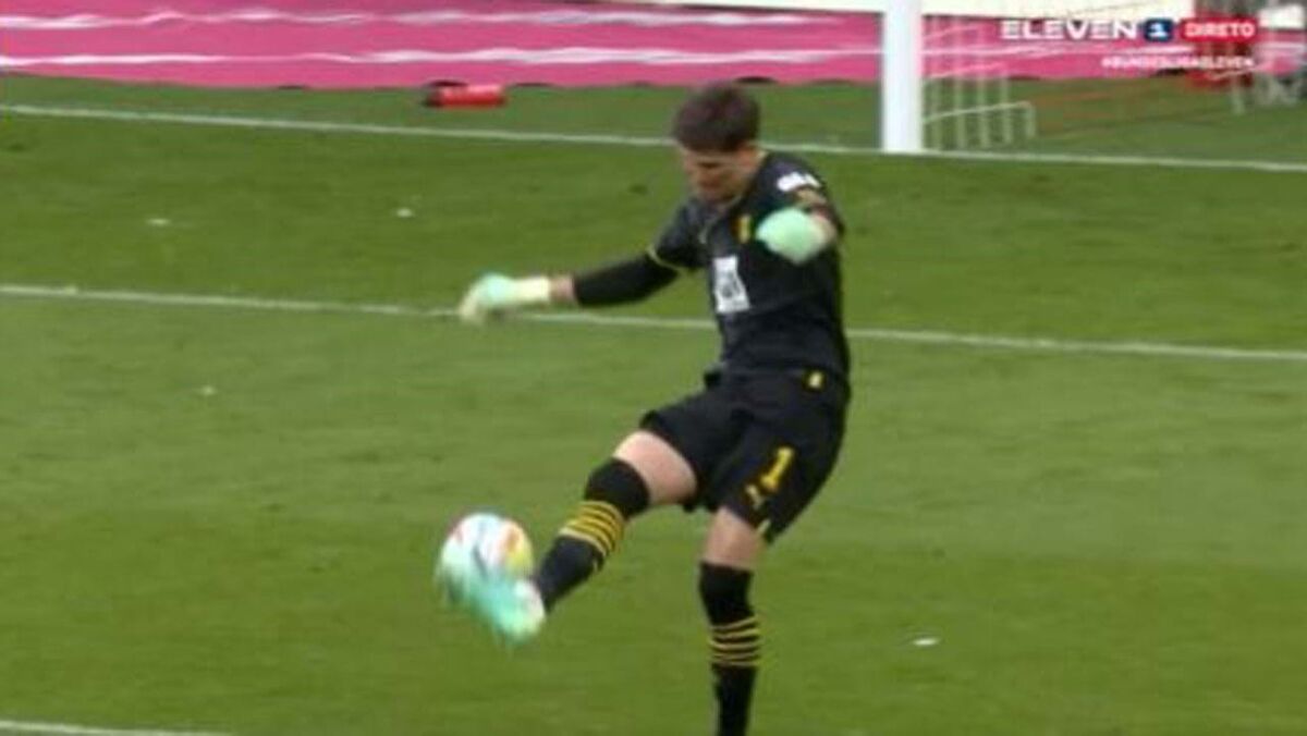 Aos 12 minutos do Bayern Munique-Borussia Dortmund, o guarda-redes dos visitantes foi protagonista de um lance inacreditável. Upamecano fez um passe longo do meio-campo, Gregor Kobel saiu da baliza para impedir que Sané ficasse isolado, mas acertou mal no esférico que acabou por encaminhar-se para a baliza.