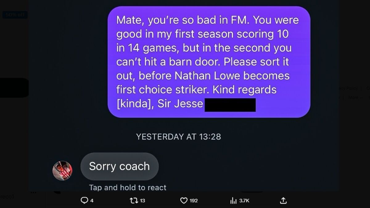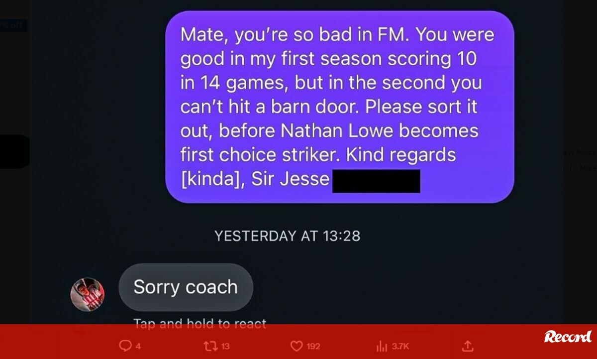“Amigo, és tão mau no FM. Estavas bem na minha 1ª época, com 10 golos em 14 jogos. Mas na 2ª não consegues acertar na porta de uma quinta. Melhora por favor, antes que o Nathan Lowe se torne a minha primeira escolha para avançado. Um abraço, Jesse”, escreveu o adepto.