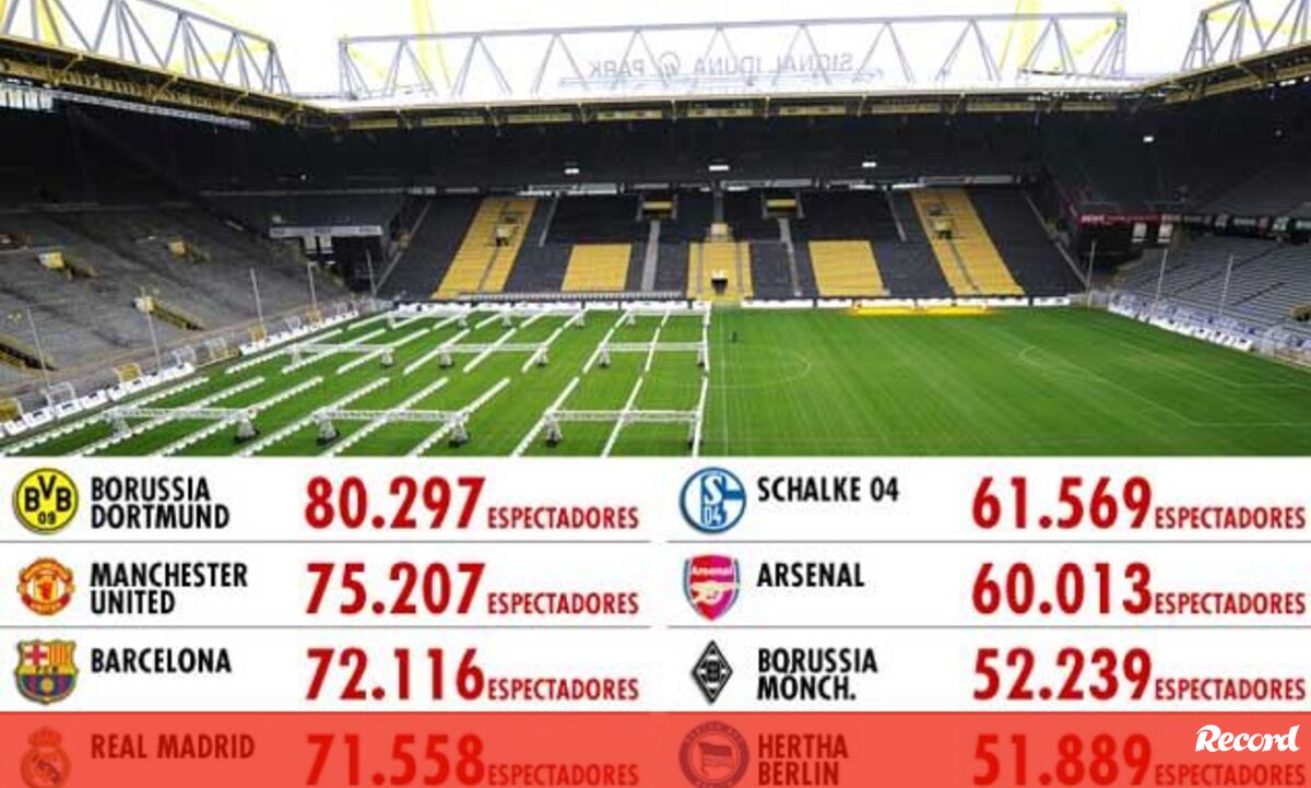 Além do palco do Borussia, surgem ainda no top-10 a Allianz Arena (Bayern Munique), Veltins-Arena (Schalke 04), Borussia-Park (Borussia Moenchengladbach), Estádio Olímpico (Hertha Berlim) e Imtech Arena (Hamburgo).