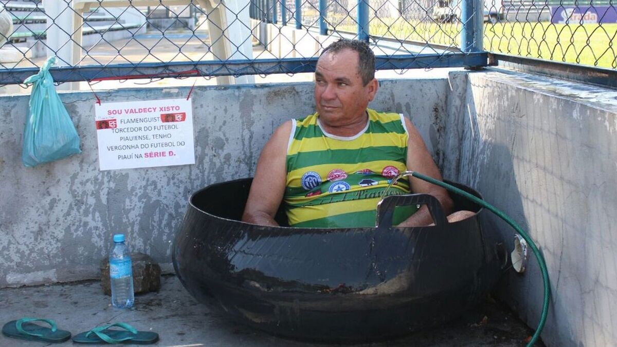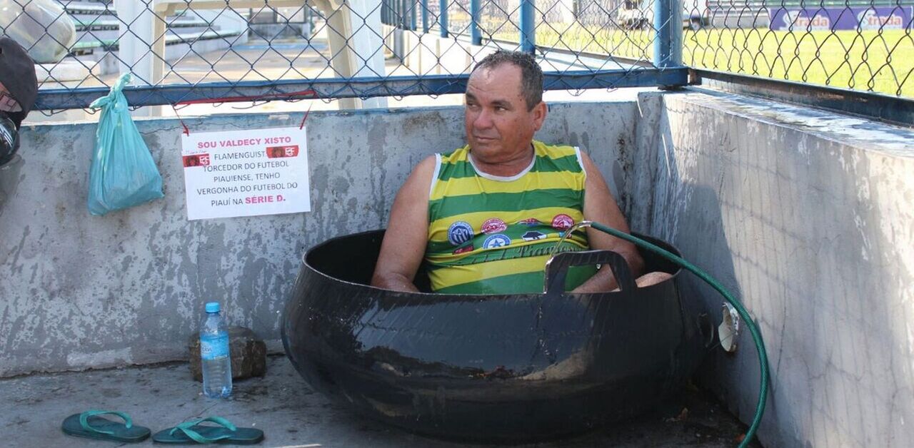 Valdeci Xisto foi ver o seu Flamengo-PI frente ao 4 de Julho, num jogo marcado para as 15h45. Os termómetros marcavam 37 graus, pelo que o adepto decidiu manter-se fresco. Assim, levou uma espécie de banheira na qual se colocou junto à rede, perto do relvado, e foi enchendo o recipiente de água com uma mangueira que ali estava.