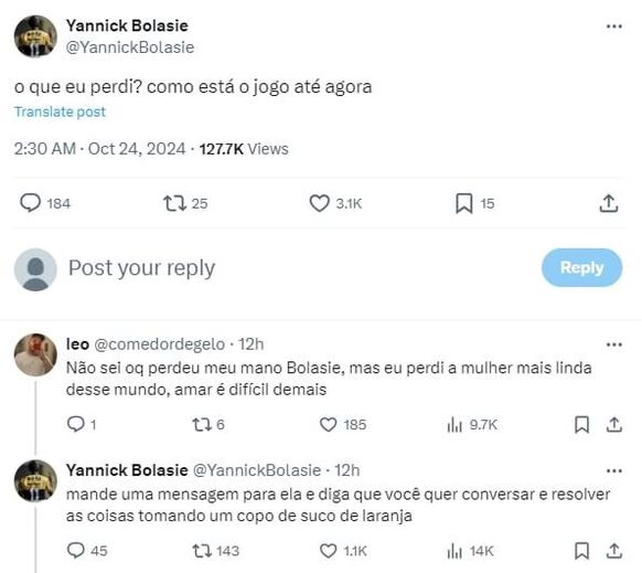 Desde que chegou ao Brasil, mais propriamente ao Criciúma, Yannick Bolasie habituou-se a conviver com alguns dos seus seguidores através das redes sociais, e na última madrugada voltou a fazer das suas, mas desta vez de maneira surpreendente. O antigo jogador do Sporting questionou os utilizadores acerca do jogo do Botafogo na Libertadores, mas a caixa de comentários do tweet acabou por se tornar... num 'consultório amoroso'.