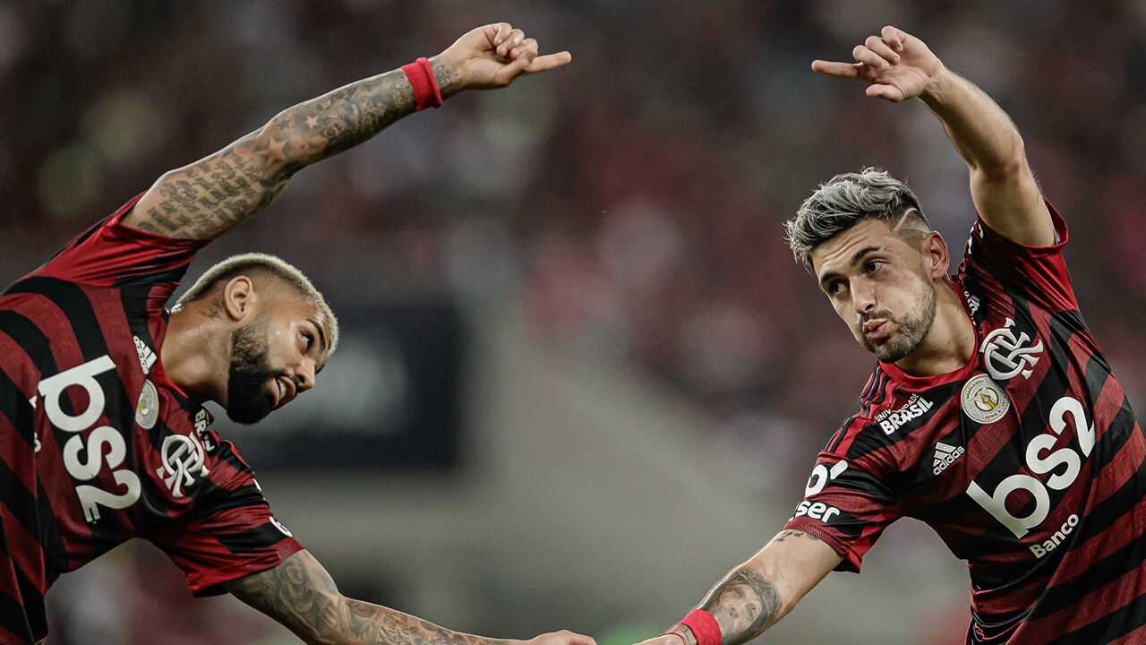 Gabigol, Bruno Henrique e Arrascaeta marcam para a equipa do português num jogo com duas expulsões