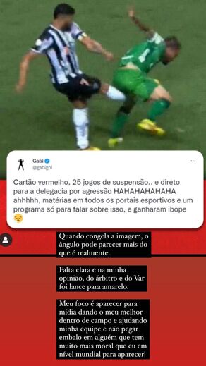 Hulk não gostou do comentário e nas stories do Instagram respondeu: "Quando se pára a imagem o ângulo pode parecer mais do que é realmente. Falta clara e, na minha opinião, do árbitro e do VAR, foi lance para amarelo", escreveu.
