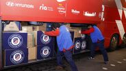 Entre os bens entregues estão mantas, tendas, calçado, productos de higiene pessoal e alimentos não perecíveis, tendo saído segunda-feira do estádio Wanda Metropolitano.